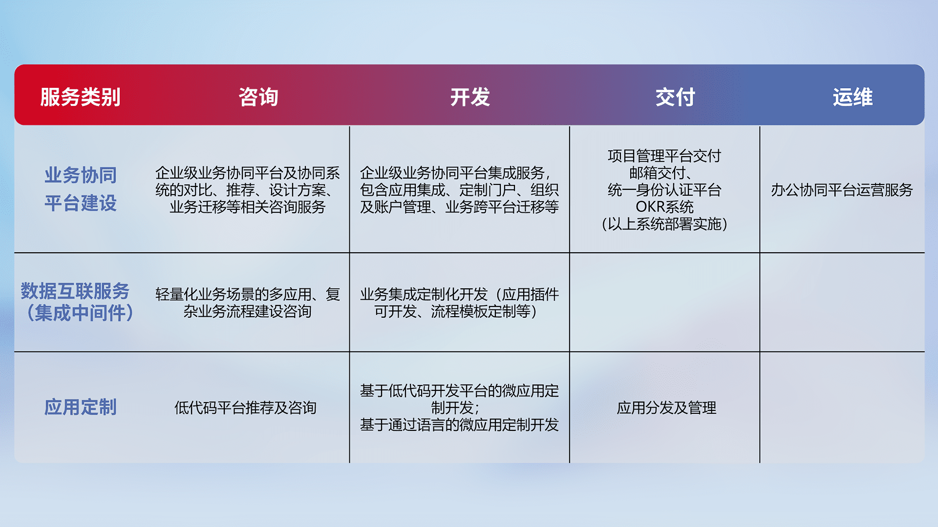 针对钉钉、、、、企微、、、IDaas等平台级产品提供产品的规划、、方案、、交付、、、、定制化开发等服务,,,实现如统一协同办公、、智能客户服务、、、混合会议管理、、、智能数据查询、、、等业务场景,,,实现数字化转型。。。